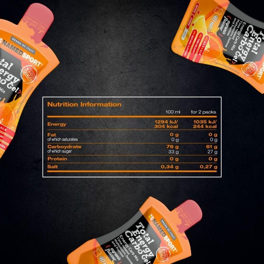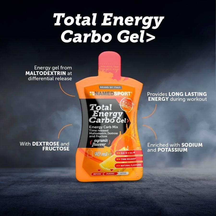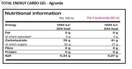 Energy-rich gel with maltodextrin at different assimilation rate: (D.E.: 9,19) dextrose, fructose, enriched with mineral salts. The balanced mix of carbohydrates with different rates of assimilation ensure a gradual and constant release of energy. Enriched with sodium and potassium. Total Energy Carbo Gel> is particularly useful in high-intensity endurance sports.