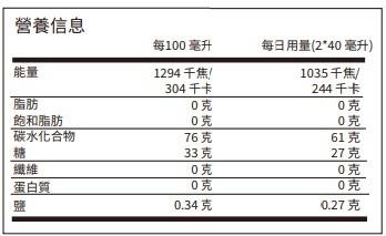 麥芽糊精(麥芽糊精18:28.13%,麥芽糊精9:9.18%),水,葡萄糖12.44%,果糖12.44%,酸度調節劑:E330;鹽酸鈉、鹽酸鉀、天然香料、檸檬汁(來自濃縮物)、防腐劑:E202。