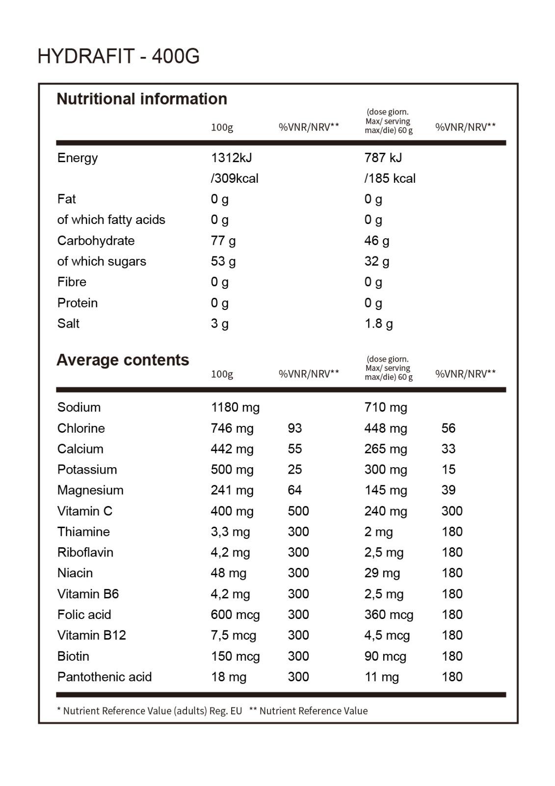 HydraFit> is an exclusive blend of mineral salts, maltodextrin and vitamins that has been specially created into a hypotonic electrolyte drink. (Osmolarity 190 mOsm/l). HydraFit> is the ideal solution for replacing the mineral salts lost by the body due to excessive sweating during intense exercise. Magnesium and potassium proper muscle functions and reduce the effects of fatigue.