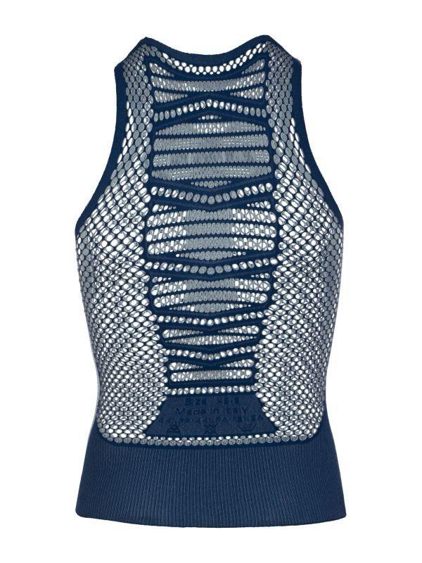 The mesh pattern of the knit is deployed in various different densities, along with open-mesh sections, mapping the thermal requirements and regional sweat rates of an athlete’s body.