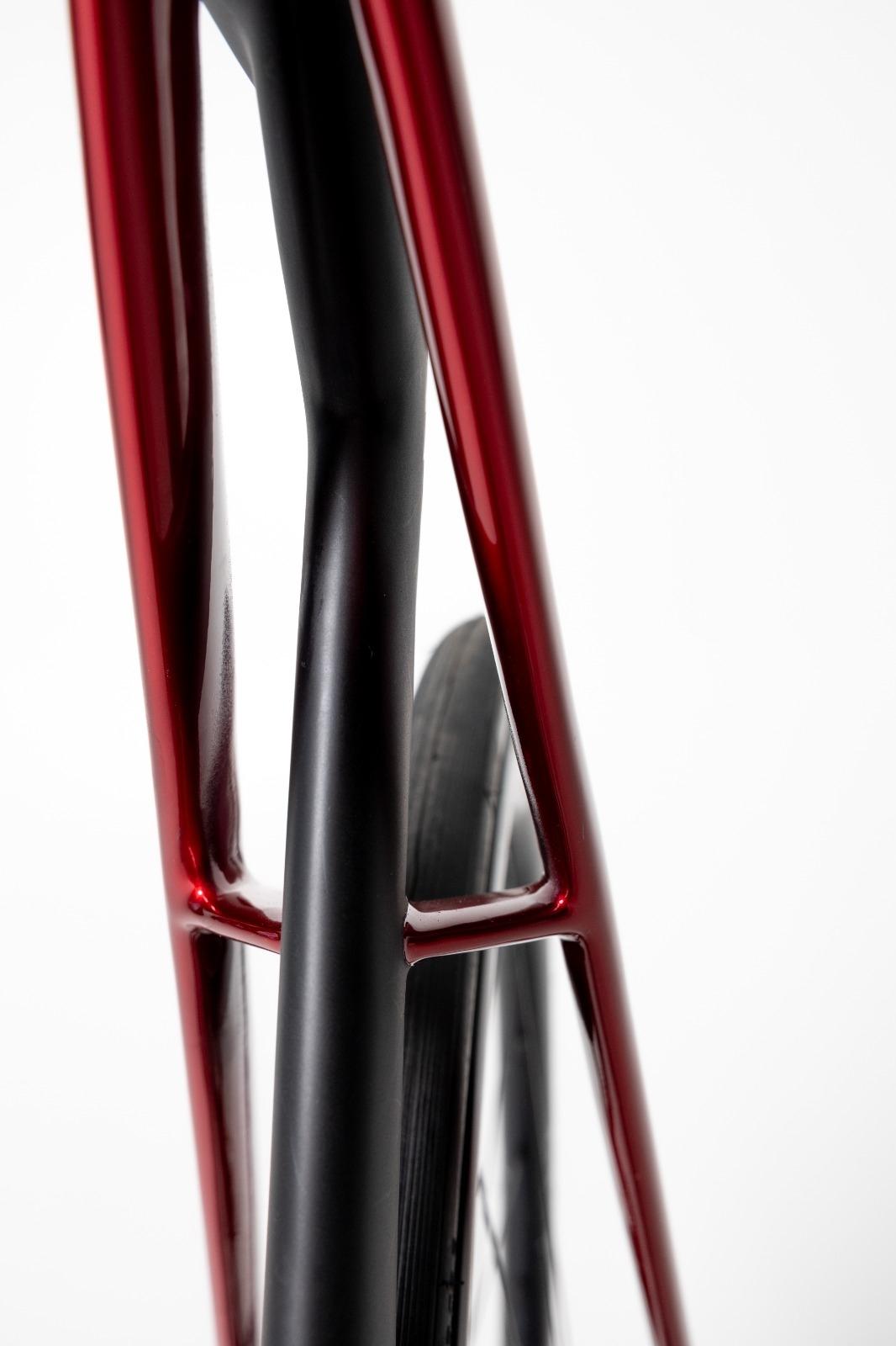 It serves to channel the air inside the frame for better penetration and lower air resistance. The air flow flows fluidity inside the two channels, positioned on the sides of the vertical tube, with an extremely reduced section and caressing the sharp profiles of the high chain stays, quickly exits the bicycle, allowing the cyclist to save precious seconds in saddle due to lower frictional resistance.