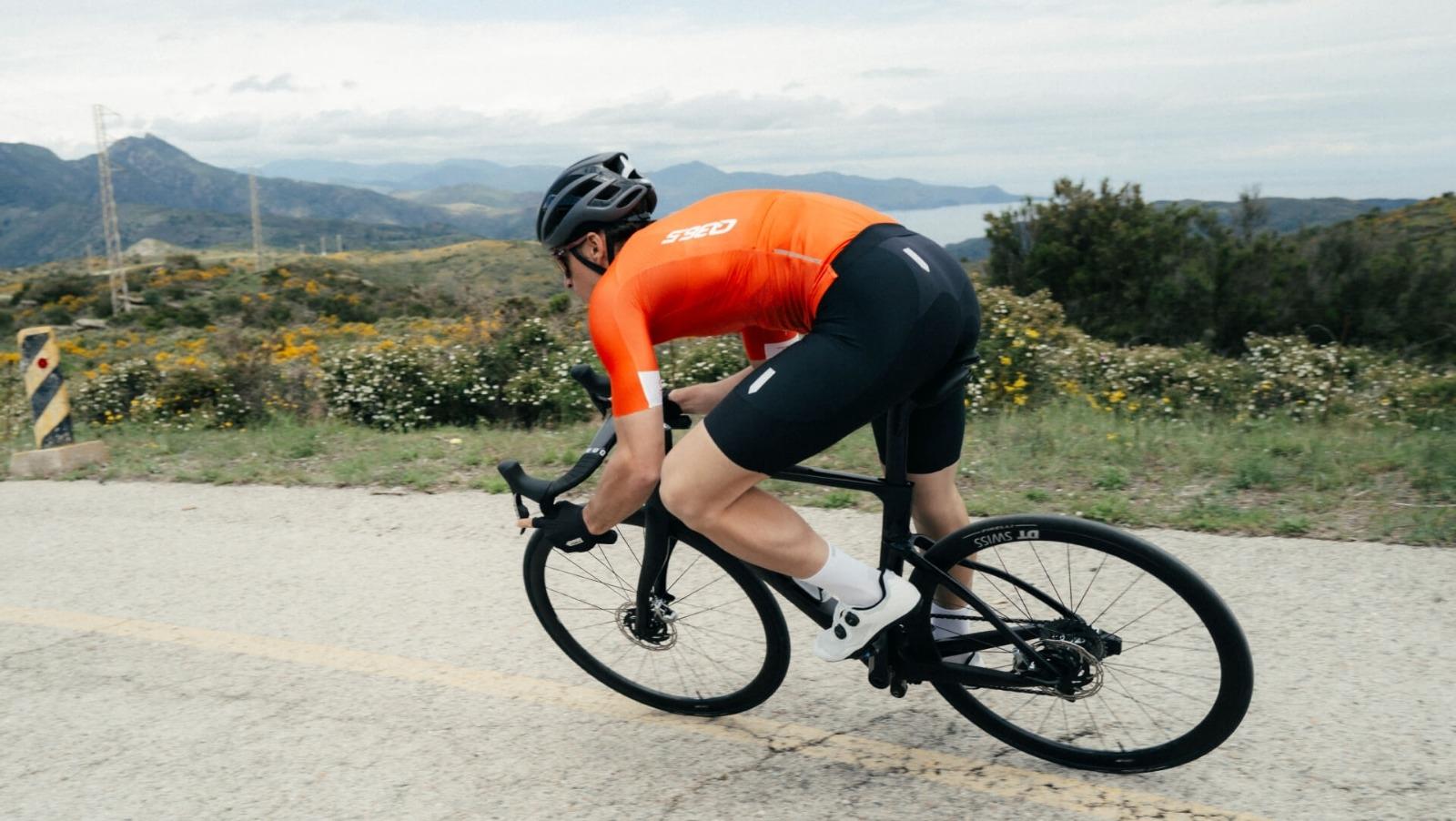 The ribbed material used for the sleeves follows the curvature of the arms to enhance the aerodynamic properties.