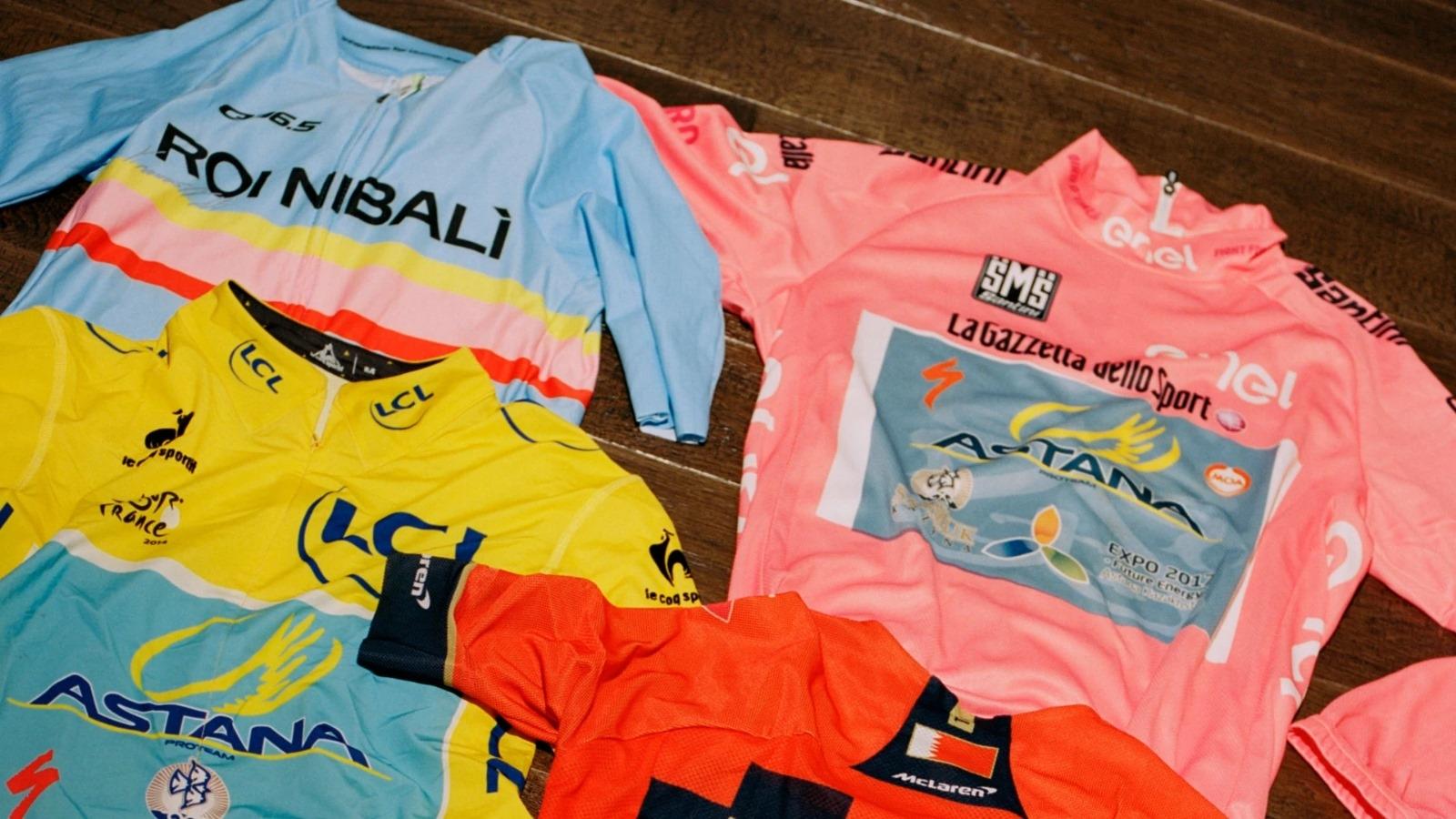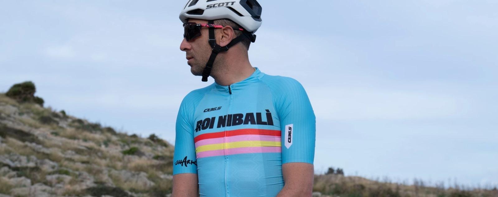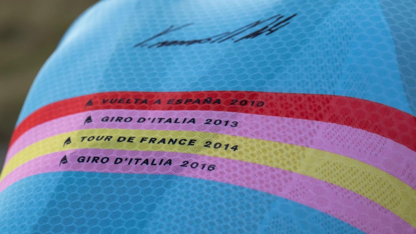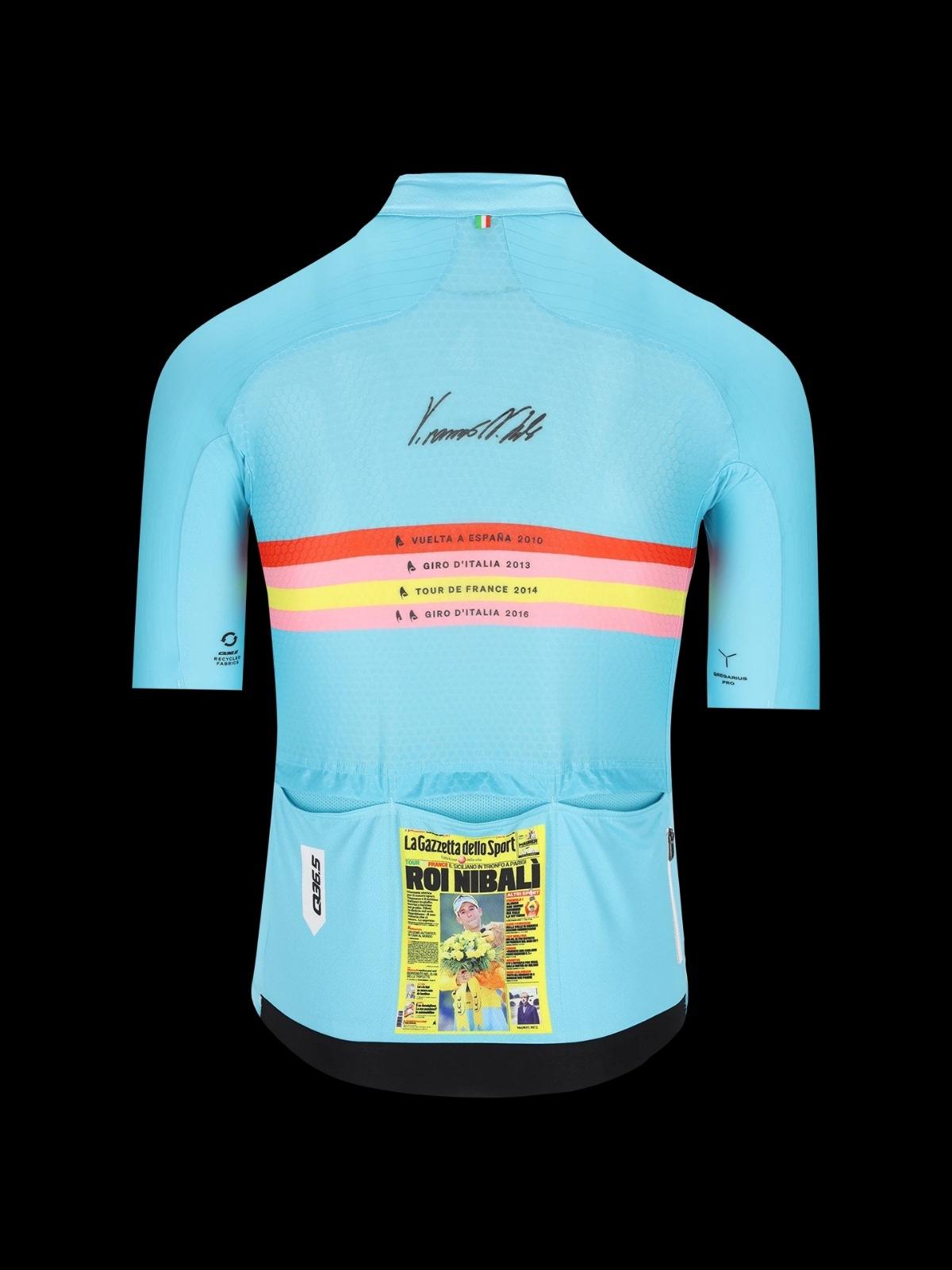 Each colour band on the jersey represents one of Nibali's historical grand tour victories.