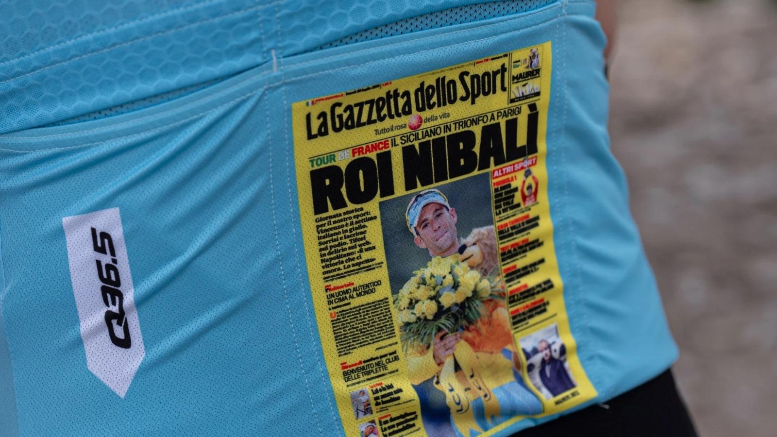 Typically printed on pink paper, La Gazzetta dello Sport was printed on yellow paper to celebrate Nibali's 2014 Tour de France victory in one of the best-selling editions of the newspaper in its history. The page is faithfully reproduced on the rear pocket of the jersey.