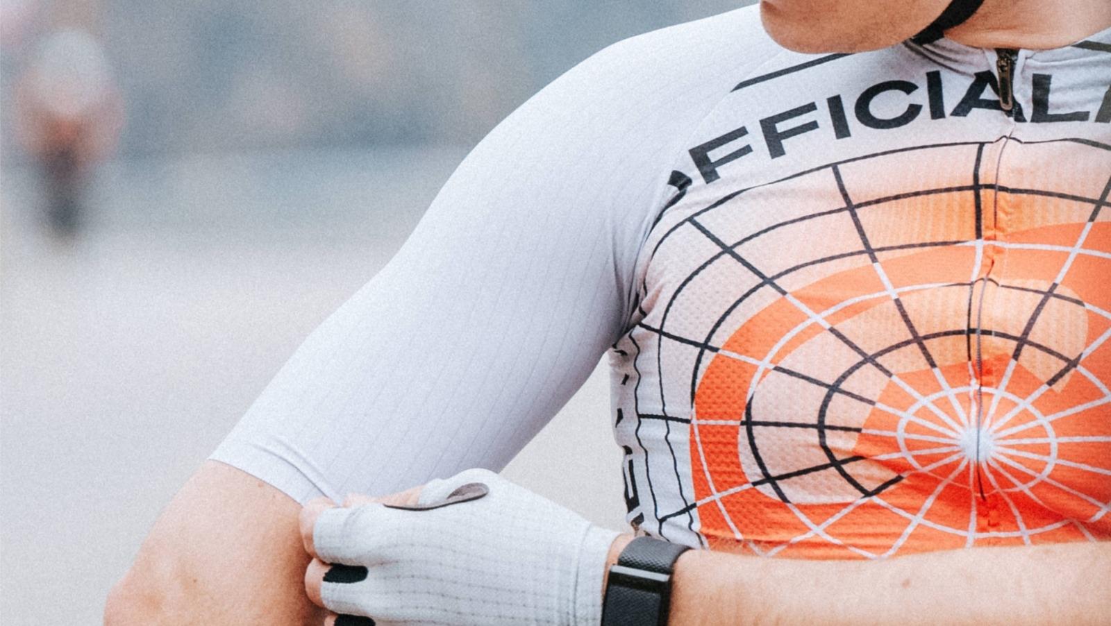 The ribbed material used for the sleeves follows the curvature of the arms to enhance the aerodynamic properties.