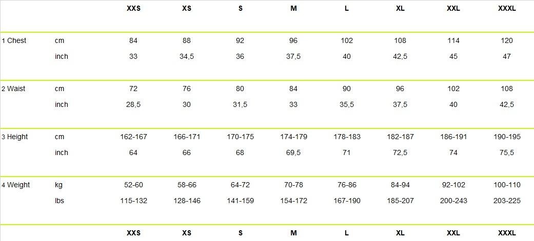 | 1 Chest | cm | 84 | 88 | 92 | 96 | 102 | 108 | 114 |