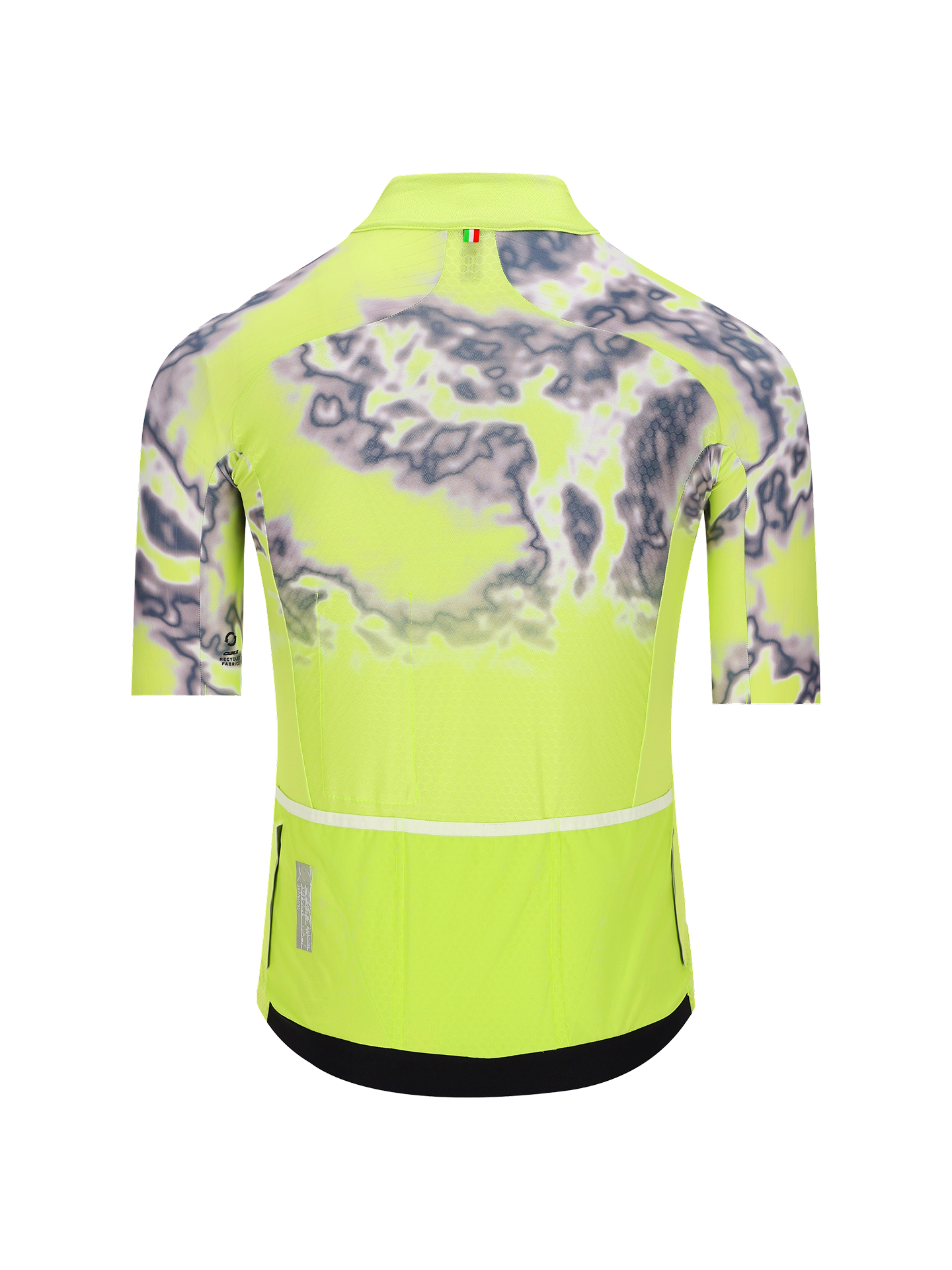 Made from a proprietary mesh knitted fabric, the Q36.5 Gregarius Clima Weathermap Jersey creates an almost imperceptible 3D structure across the torso to improve ventilation as well as moisture transfer. The honeycomb material used for the back panels encourages a push-pull effect to prevent moisture build-up while moving the sweat to the outer layer of the fabric where it can evaporate quickly whilst the raglan sleeve design uses the same ribbed aerodynamic fabric as our Gregarius Pro Jersey. The overall feeling of lightness is further enhanced by the mesh rear pockets, exclusive to this model. The striking “weathermap” graphic is inspired by the visual iconography of detailed weather maps that a serious Dolomites cyclist is obliged – due to the highly variable conditions of our local mountains – to check before going out for a ride