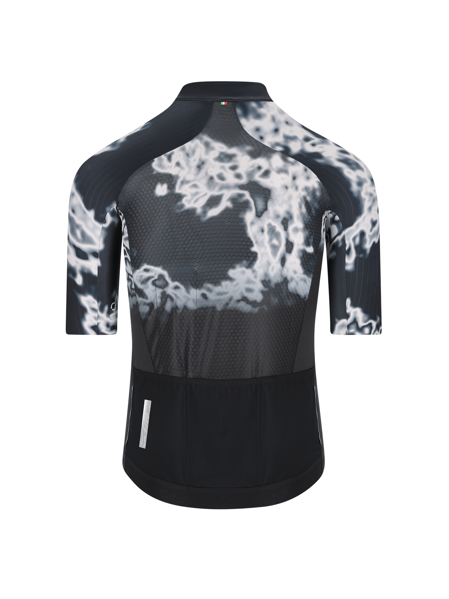 Made from a proprietary mesh knitted fabric, the Q36.5 Gregarius Clima Weathermap Jersey creates an almost imperceptible 3D structure across the torso to improve ventilation as well as moisture transfer. The honeycomb material used for the back panels encourages a push-pull effect to prevent moisture build-up while moving the sweat to the outer layer of the fabric where it can evaporate quickly whilst the raglan sleeve design uses the same ribbed aerodynamic fabric as our Gregarius Pro Jersey. The overall feeling of lightness is further enhanced by the mesh rear pockets, exclusive to this model. The striking “weathermap” graphic is inspired by the visual iconography of detailed weather maps that a serious Dolomites cyclist is obliged – due to the highly variable conditions of our local mountains – to check before going out for a ride.