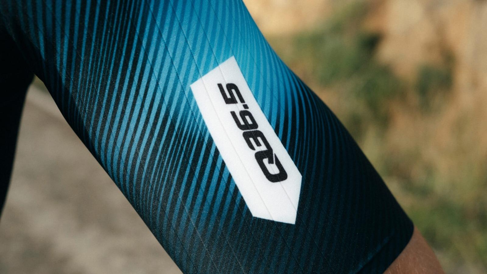 The ribbed material used for the sleeves follows the curvature of the arms to enhance the aerodynamic properties.