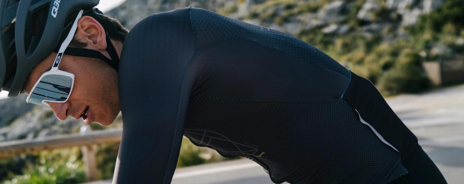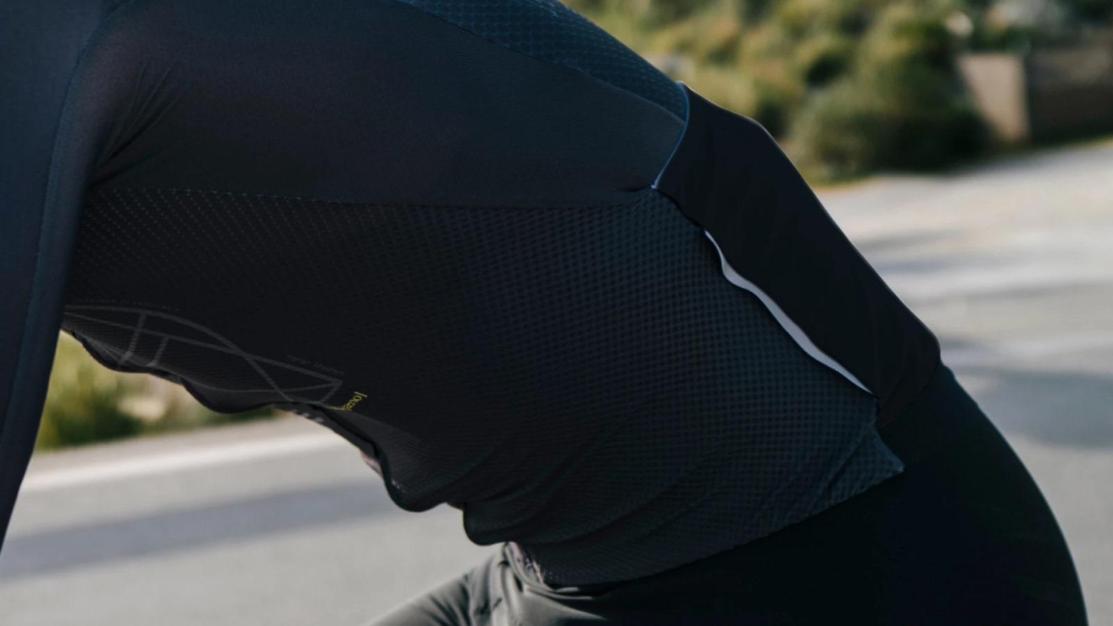 The ribbed material used for the sleeves follows the curvature of the arms, reducing drag, therefore improving aerodynamics without compromising freedom of movement.