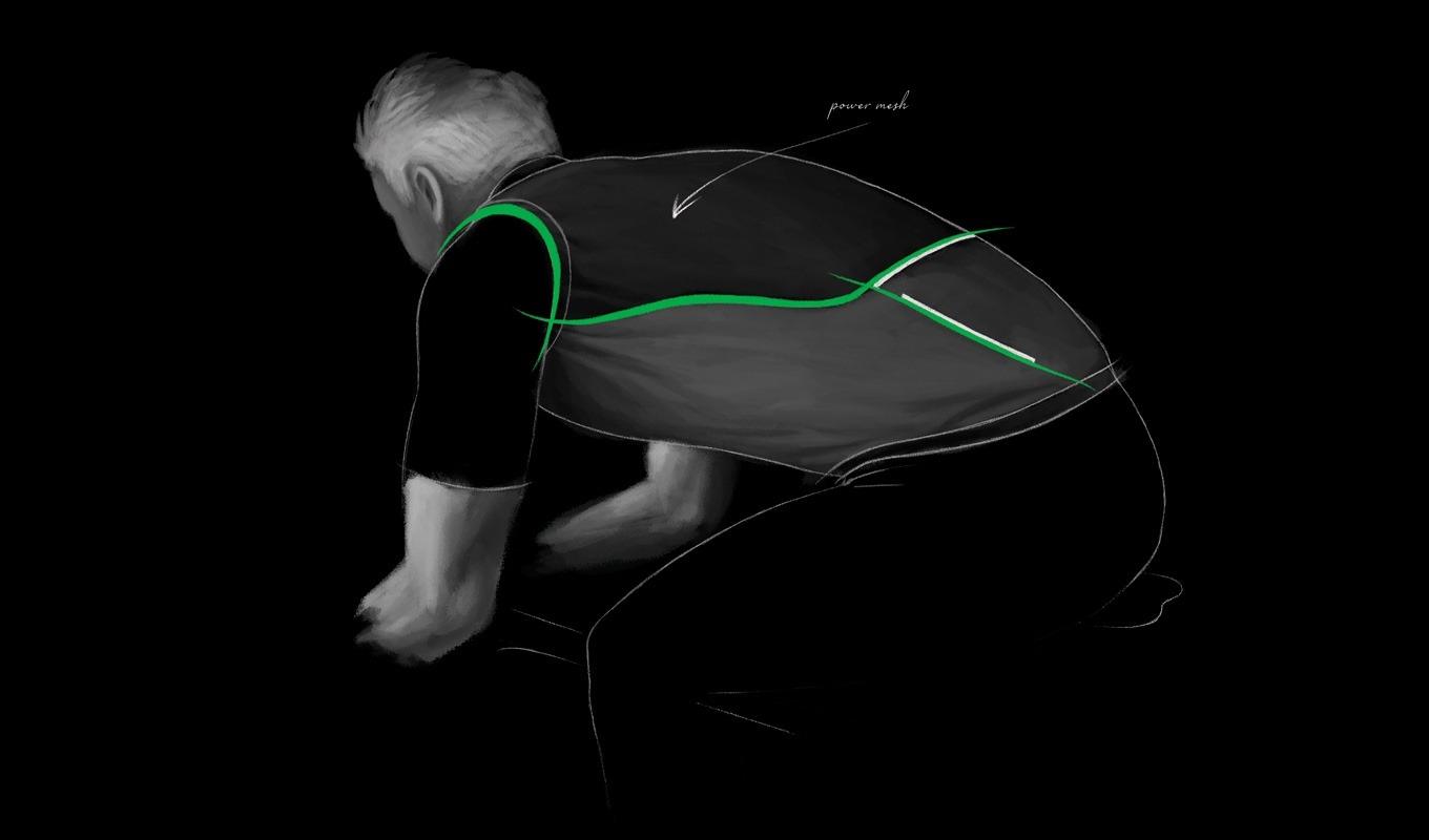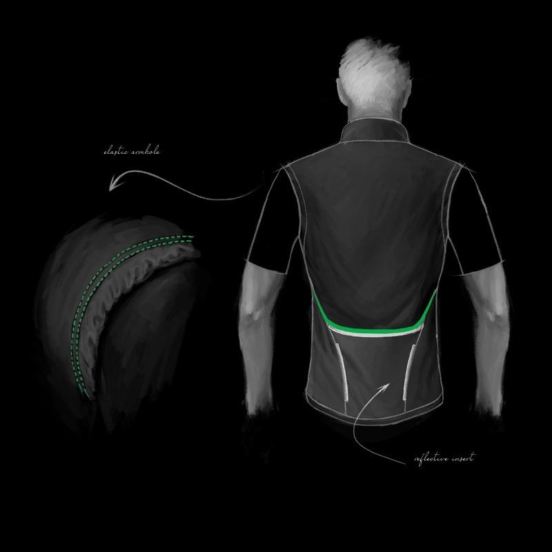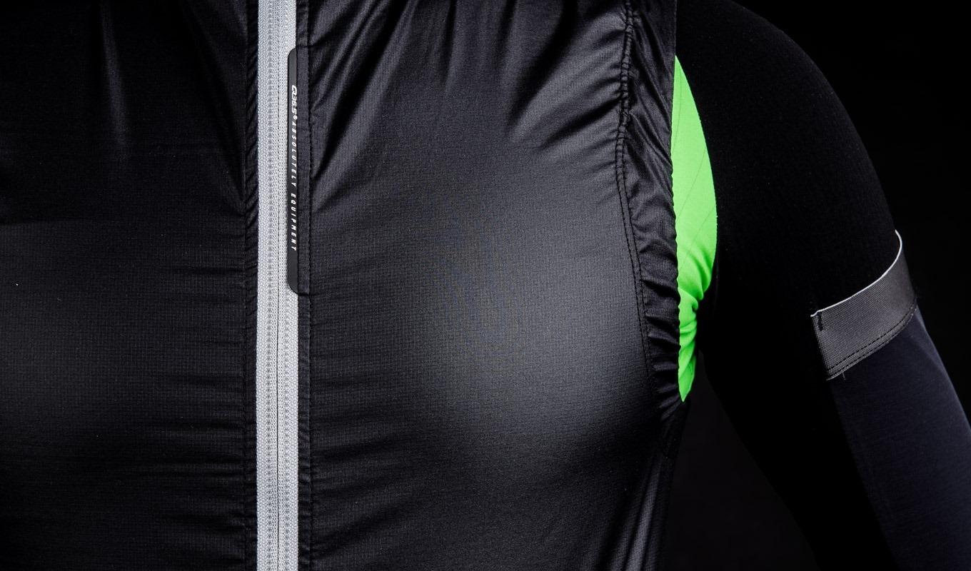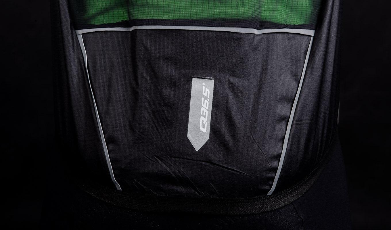The cut allows for maximum freedom of movement thanks to its pre-shaped construction and the four direction stretch of the woven fabric. Reflective inserts on the back, and along the camlock zipper increase visibility.
